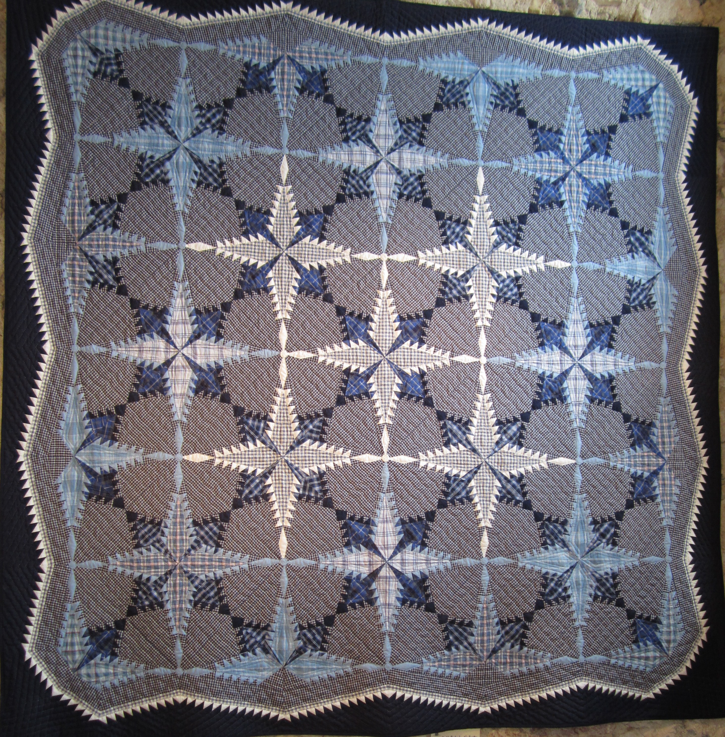 Mon troisième coup de foudre est pour Gabrielle Paquin. D’abord, elle maintient son goût pour les quilts bleus traditionnels, contre vents et marées ! Cette couleur si aimée et utilisée au XIXe siècle dans les quilts n’est que rarement représentée dans les expos rétrospectives. Pourquoi ? Le rendu est-il trop frais et « moderne » ?… Gageons que dans les années qui viennent les indigos/blancs vont refaire surface, après le succès historique de l’expo rouge/blanc de New-York ! Gabrielle a su imposer, au fil des ans, une étoile mennonite à Brouage, puis un pur bicolore bleu/blanc (la Roue du Charpentier), et cette année on a eu une époustouflante création bleu/blanc/marine d’esprit country du fait des tissus à carreaux utilisés, mais si sophistiqué par la maquette… Bravo Gabrielle !