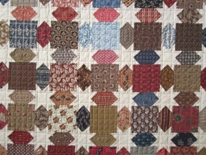 France Aubert expose cette année pour la première fois à Brouage mais c’est une entrée remarquée ! Je crois ne pas me tromper en écrivant qu’elle est profondément amoureuse des quilts anciens des Etats-Unis, son remarquable parcours et son blog en témoignent. Son style est souvent marqué par l’influence country avec une judicieuse utilisation de tissus dits humbles, souvent à carreaux ou petits motifs, qu’elle sait si bien assortir aux fleurs et tissus plus complexes. Sa palette est souvent tendrement passée mais jamais trop douce. J’aime aussi la liberté qu’elle s’octroie en osant changer complètement la gamme de couleurs d’un modèle ancien (comme pour 1692 rue de l’Observatoire) ou sa capacité à inventer des modèles (Les Maisons Roses).