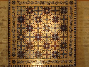 Si vous souhaitez participer à cette exposition de prestige, vous avez donc bien compris que votre ouvrage devra évoquer l’esprit « quilt américain d’il y a 100 à 150 ans », l’Age d’Or des quilts classiques, il sera donc cousu de préférence avec des tissus « repro » qu’on peut à présent acheter facilement… Quoi d’autre ? Un conseil de D.Husson : ne pensez pas à la dimension du lit de votre petite nièce, pensez à… Brouage. En clair, pas de long rectangle disgracieux de la taille d’un couvre-lit une place, privilégiez les grands… jusqu’à immenses carrés, ou bien des rectangles élégants ! Le minimum est 1,50m de côté. Là encore, il faut accorder le droit au jury d’accepter un quilt extrêmement travaillé de 1,47m… et d’en refuser un autre d’ 1,50m pile. Les plus petits seront le plus souvent disposés sur des tables centrales, on les voit bien mais ils sont plus difficiles à bien photographier.