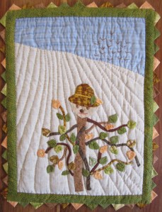 L’Epouvant’Arbre de Martine, sa première création ! Appliqué et quilting main, point de prairie en bordure reprenant les tissus des feuilles du drôle de « personnage ».