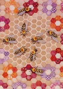 Difficile de choisir entre les blocs, mais celui-ci est peut-être mon préféré… et n’est pas étranger au nom de ce blog ! Il rappelle les réunions dans les villages et hameaux aux Etats-Unis, surtout en fin du XIXe siècle, où les femmes se réunissaient pour quilter ensemble sur un même ouvrage. Cela fait bien sûr référence au travail collectif d’une ruche.