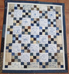 Enfin, une barre Google Translate veut bien s’installer, mais parfois le texte traduit est à pleurer… Pour me faire pardonner de ne pas faire l’effort de traduire moi-même, voici un petit ouvrage que j’ai adoré broder, symbolisant un peu notre communauté de quilteuses sans frontières puisque les textes sont en anglais, mais le modèle est allemand :