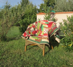 A gauche, la magnifique antiquité de 1880 dans un hors-série Quiltmania. A droite, pour couvrir un fauteuil fatigué, mon 3e « grand log cabin », cousu avec des bandes plus larges (6 cm coupées) et une gamme restreinte de couleurs. Il fut fait à toute vitesse, quelques jours avant le déménagement de ma fille ; c’est celui que j’aime le moins, pas assez scrappy, bandes pas assez fines…. Le n° 1 est chez mon autre fille, le n° 2 (à dominante turquoise-marine-jaune) est chez mes parents en Bretagne. Le n° 4 ? En couleurs plus claires, en attente de quilting…