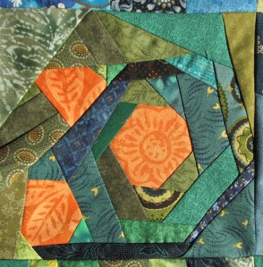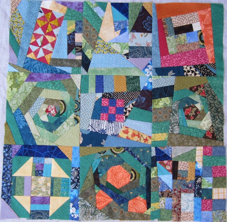 Donc ce quilt sera, dans ma tête, inspiré des couleurs de l’Amazonie, ses fleurs, ses arbres, les papillons et perroquets, les pirogues multicolores sur l’Amazone, les maisons colorées des petites villes bordant le fleuve : dominantes vertes, bleues, terre, d’où émergent soudain des couleurs éclatantes… Je ne délaisse pas pour autant le fil conducteur : des blocs un peu fous, tordus et ne respectant plus les règles élémentaires  du patchwork traditionnel. J’y inclus mes premiers essais de blocs de miettes, cousus naguère d’après les explications de Bonnie.