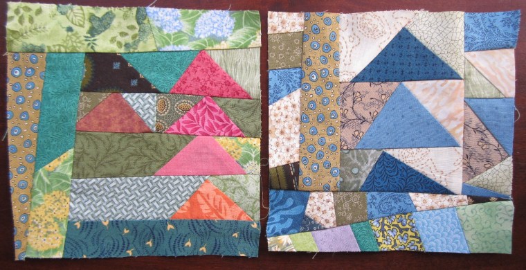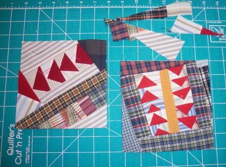 Ici les vols d’oie de Jo… et ci-dessous les miens. Si vous commencez vous aussi des blocs de miettes, ne vous inquiétez pas si vous trouvez un bloc pas très beau tout seul, il sera entouré des autres et se mettront mutuellement en valeur ! C’est du moins ce que je me souhaite 😉
