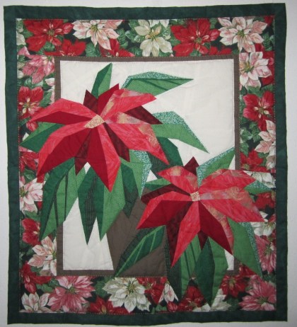 C’est un modèle américain qui est passé de main en main dans mon club il y a maintenant une douzaine d’années. C’était mon premier ouvrage en couture sur papier, j’étais alors fan absolue de cette méthode qui permettait une telle prouesse ! Je le trouve maintenant un peu trop kitsch, mais mon mari l’aime beaucoup, alors ce petit tableau trouve encore une place sur le mur pour Noël… Mes parents ont le même tableau, seul le tissu de la bordure diffère. Chez eux, c’est toute l’année Noël car ils ne le décrochent jamais !