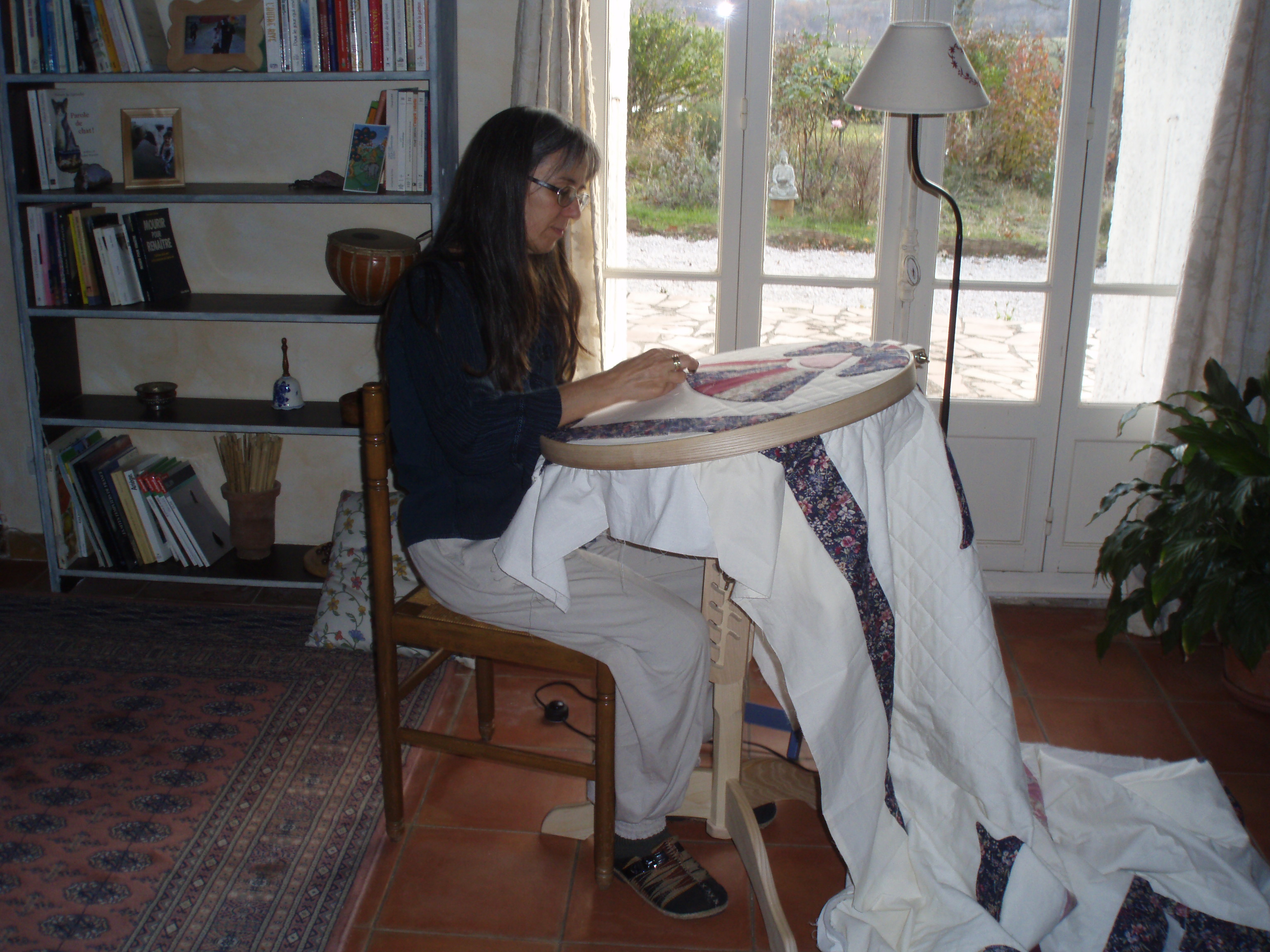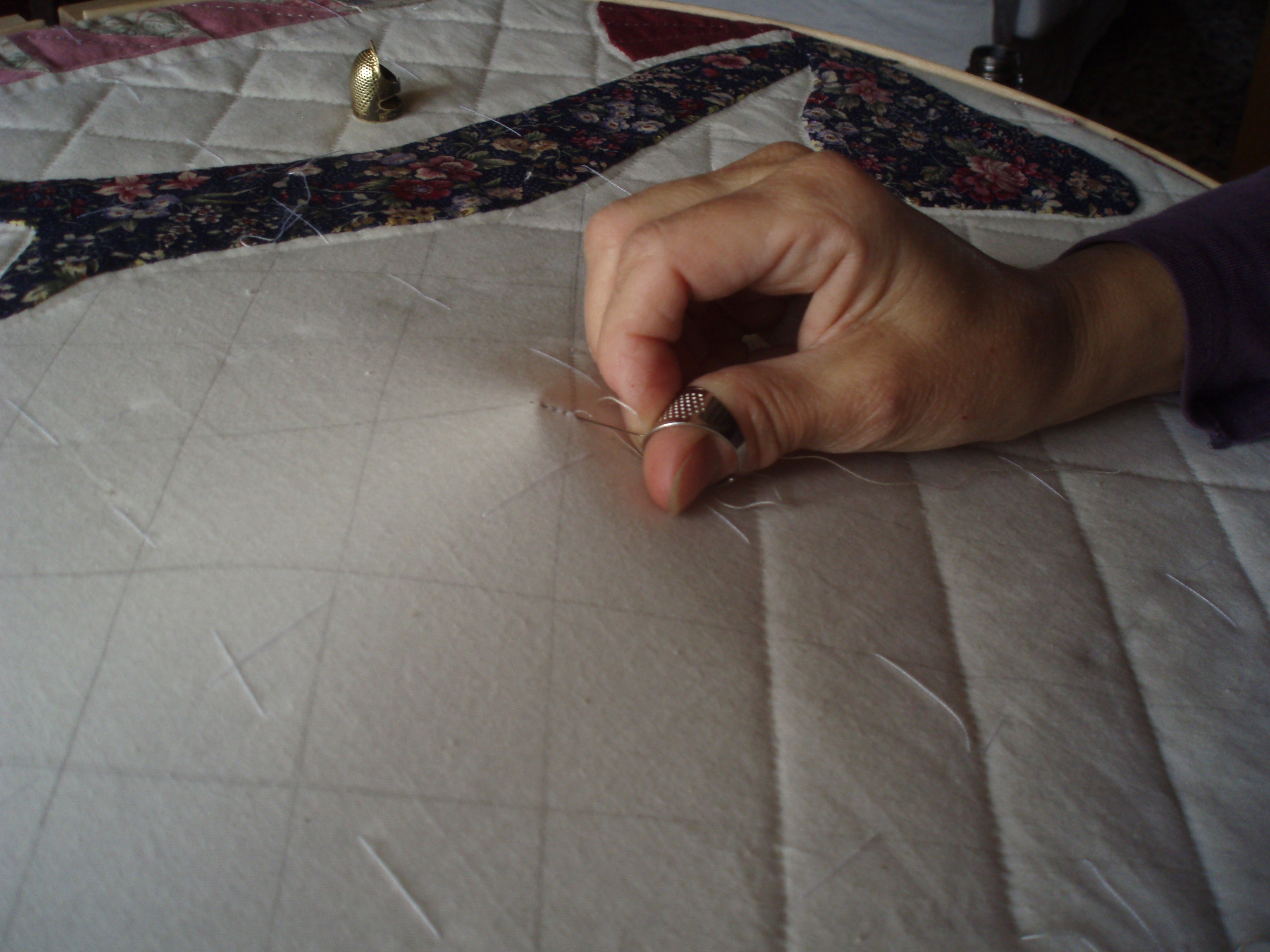 Tools for quilting: the frame or the standing hoop and 3 thimbles! The advantage of the frame is that the quilt doesn’t need to be basted. The difficulty: we cannot change the patchwork ‘while quilting’; it should be finished before removing it from the frame. The other concern: the place that it can take in the house. Frequently, in the American houses, they have a system of pulleys to elevate the frame with the quilt to the ceiling! The quilt you can see on the pictures is basted because I had already started it before my training course with Esther Miller.
