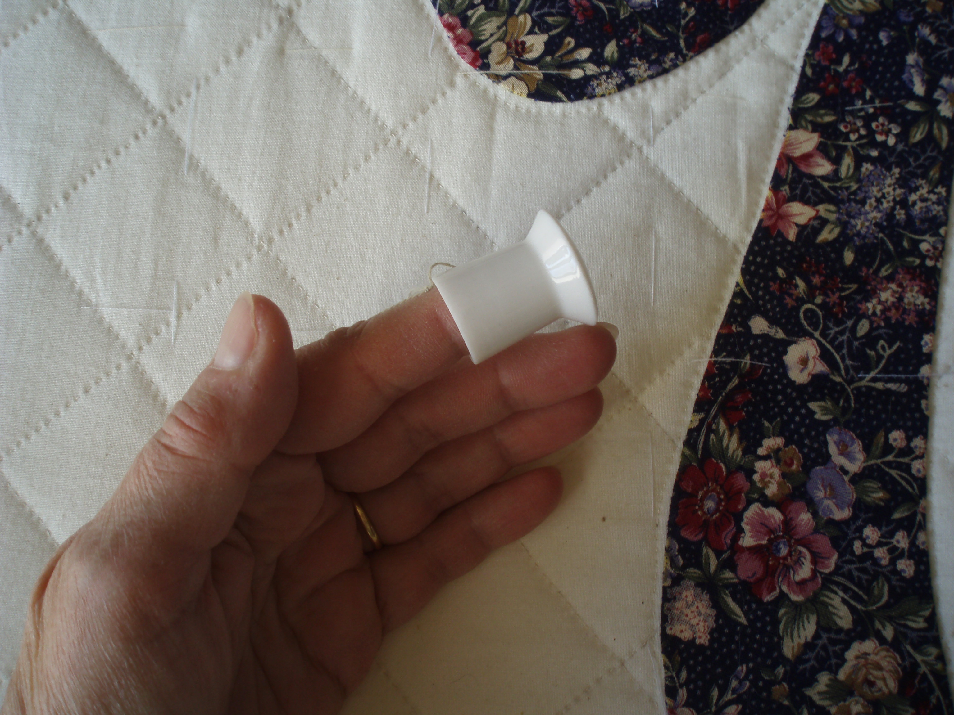 Los dedales: para el dedo mayor (mano derecha para los diestros), yo utilizo el ‘dedal abierto para quilt’ de Clover, es ajustable y mi dedo no transpira. Personalmente como novedad, el dedal más importante es el dedal para el dedo pulgar, para acolchar hacia arriba (sin hacerse mal!). Yo tengo un ‘dedal anillo’ abierto y ajustable también de Clover. Hay otro dedal para el pulgar, el ‘Thumb Thimble’ de Ted Storm para acolchar alejándose de uno mismo sin lastimarse el pulgar. La otra novedad es el 3° dedal, que utilizo por debajo del quilt (mano izquierda) y empuja el quilt hacia arriba; esto me permite hacer puntadas muy pequeñas. La aguja ‘se hunde’ atravesando los tres espesores del quilt contra el borde del dedal y no contra mi dedo, y luego ‘sube’ de nuevo mientras que el dedal se desliza por debajo del quilt (no es muy fácil la descripción del movimiento!). Yo tengo un dedal en porcelana que adoro (ver pagina web de Esther Millar), pero hay también un dedal de plástico (Marian’s Magic Thimble, se vende en Cotton & Color), la aguja se engancha un poco y raya el plástico, pero de todas maneras funciona.