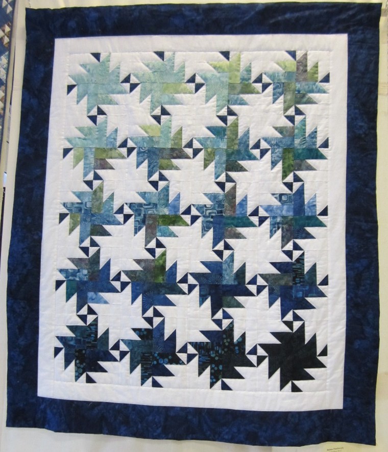 C’est avec une gamme de batiks qu’elle a réalisé ce magnifique quilt avec un dégradé évoquant l’Océan…