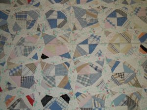 Pour rendre ce top plus chaud, on prenait parfois des quilts très élimés en guise de molleton. Pas question alors de quilter ceci avec de jolis petits points ; le matelassage se faisait le plus rapidement possible, parfois avec des noeuds qui maintenaient simplement les couches ensemble.