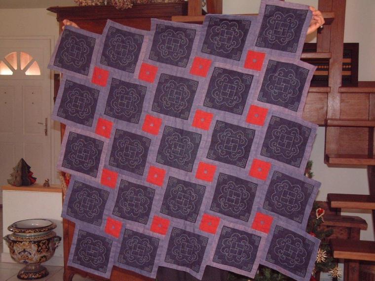 En 2003, l’orage grondait dans la vie de Maïté. Toujours vaillante, elle entreprit, pour se changer les idées, un quilt bien singulier, aux carrés juxtaposés « sashikotés ». Pour conserver un esprit rustique, elle choisit des tissus artisanaux (du lin, du chanvre, du ramie ?…) aux teintes bleu denim superbes, l’un foncé l’autre plus clair. Le résultat la ravit, mais elle l’appellera Ciel d’Orage en raison de la dure période qu’elle traversait alors.