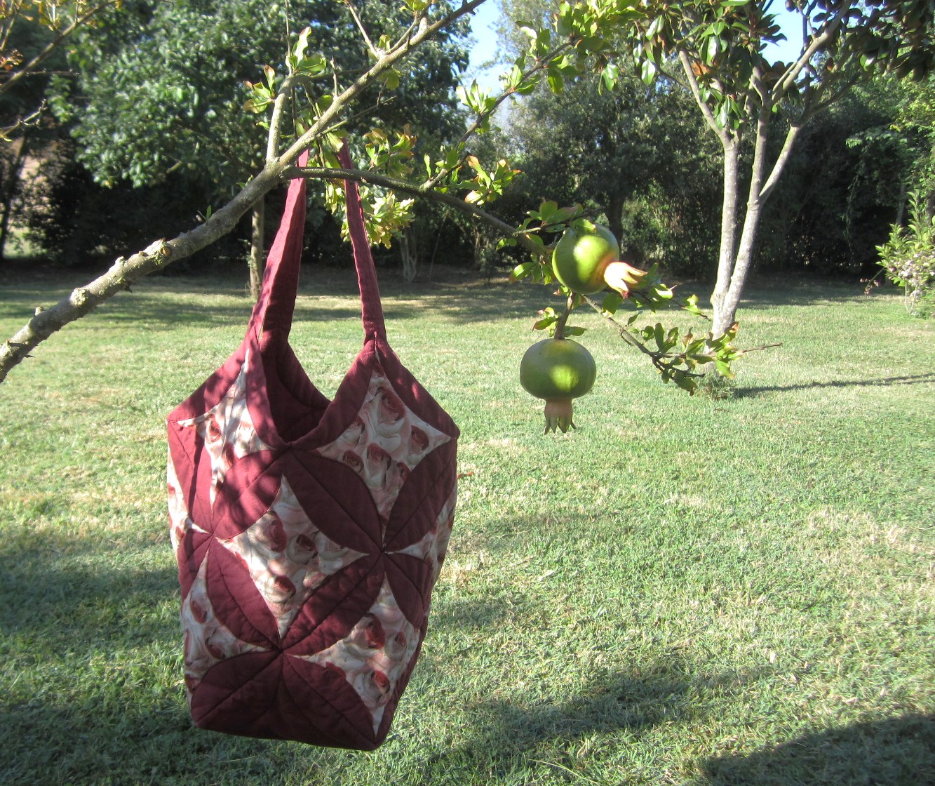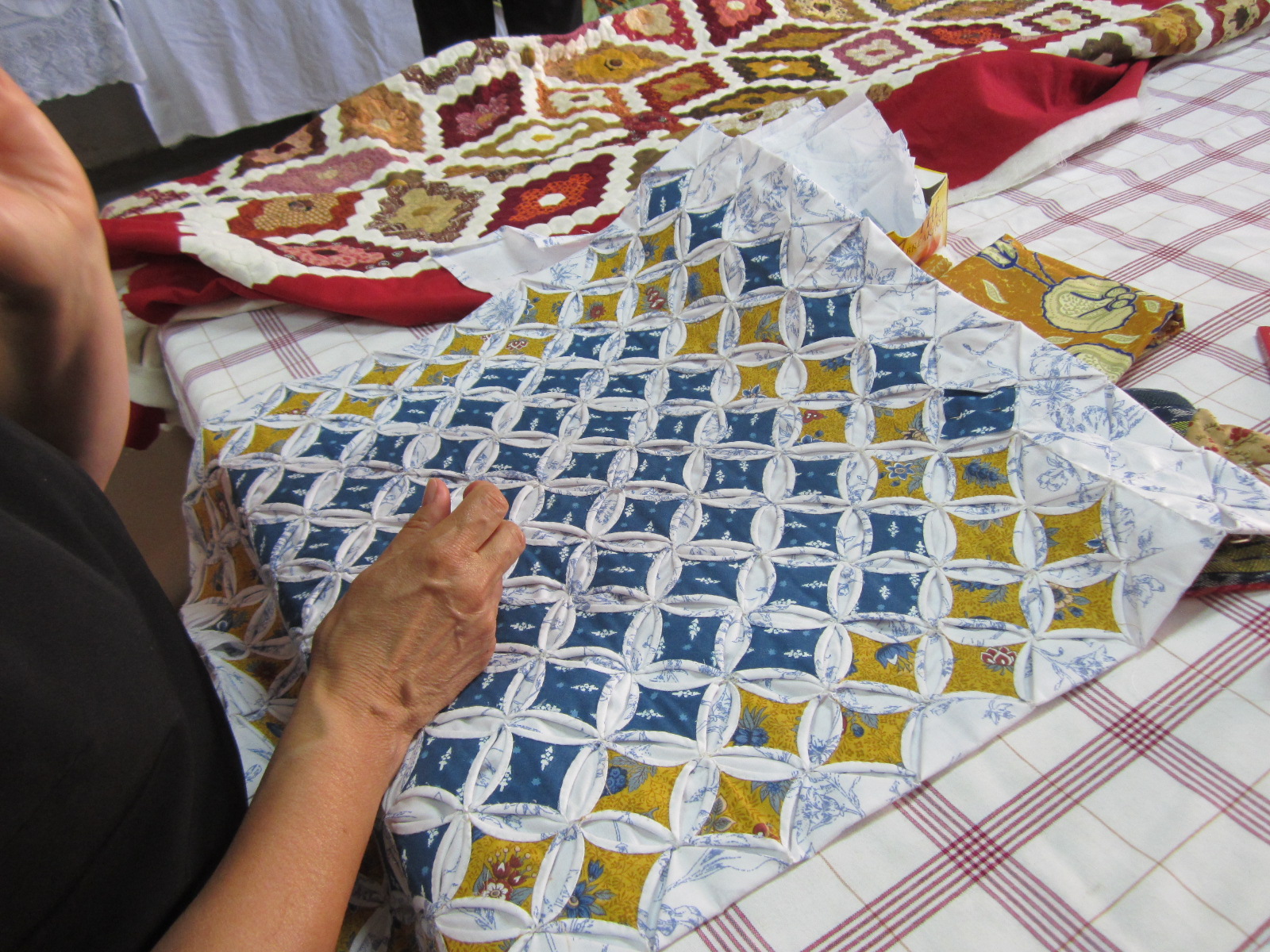 J’ai donc ressuscité mes essais de plus de 20 ans (devenus alors des couvertures de poupées de mes filles) et expliqué « les trucs à savoir ». Oh la quantité de tissu utilisé fait peur ! Mais il n’y a ni tissu de doublure, ni molleton… Etrange technique de pliage ! Nous avons passé l’après-midi à discuter de cette technique qui rappelle les cocottes en papier de l’enfance mais qui vient sans doute du pays de l’origami… Impossible de trouver des textes formels sur internet.
