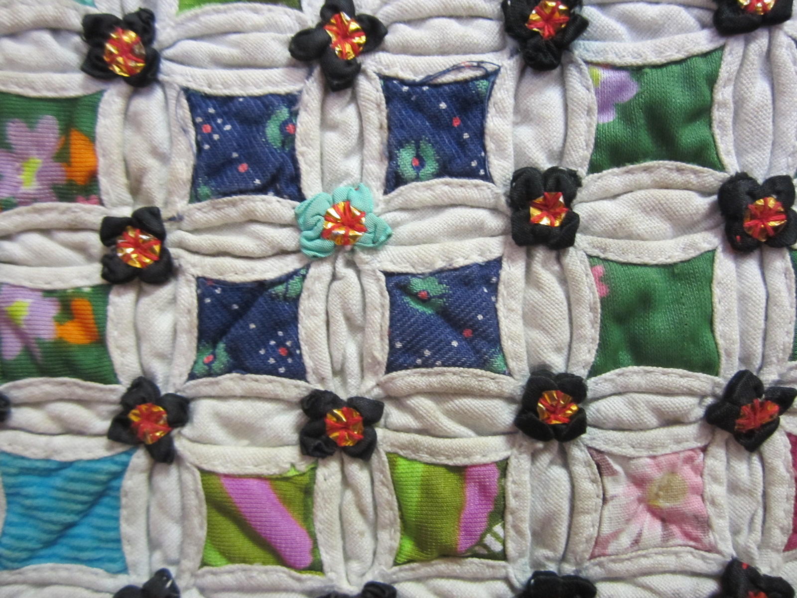 J’ai eu ensuite le même jour la -presque- preuve de l’origine asiatique des Cathedral Windows, « presque » car rien n’est simple ni définitif dans les recherches dilettantes…  Au centre du continent asiatique, aux confins de la Birmanie, du Laos, du Vietnam et de la Chine, des femmes cousent depuis « toujours » des… vitraux de cathédrales. Comment les nomment-elles ? J’imagine que ce peut être le nom d’une fleur à quatre pétales par exemple, leur vie est tellement en symbiose avec leur environnement…