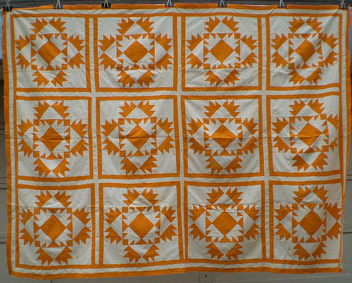 Dans les quilts anciens — et les reproductions — l’orange est bien présent et on l’appelle souvent Cheddar, comme ce fameux fromage anglais… Certaines quilteuses actuelles (Gwen Marston, Bonnie Hunter et d’autres !) en ont parlé, l’ont utilisé, ont suscité des envies… et nous avons donc maintenant de nombreux quilts de style traditionnel mais ne manquant pas de peps !