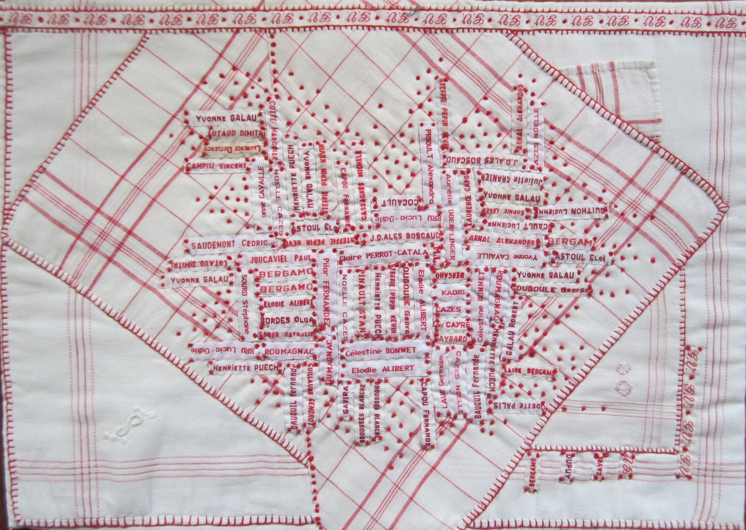 Etiquettes marque-linge que nous avons connues dans notre enfance, artistiquement mises en scène par Cécile Milhau. Points de noeud et points de feston s’accordent parfaitement avec les carreaux et écritures…