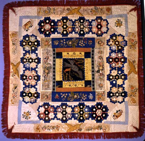 Il est quasiment établi que ce quilt fut réalisé à partir des restes de tissus des robes de la Première Dame ! Il mêle comme souvent au XIXe siècle la présentation en forme de Médaillon, des assemblages à l’anglaise (les hexagones), des appliqués vraisemblablement découpés dans des chintz : un cadre de goût pour une liberté de construction de la quilteuse qui, toujours à l’époque, créait ses ouvrages.