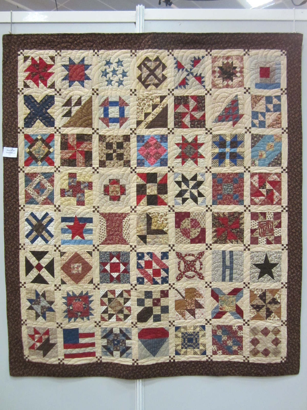 Martine a quilté jour et nuit (c’est vrai…) pour terminer à temps ce quilt à exposer à Colomiers… Il fut assemblé, semaine après semaine, en compagnie virtuelle de centaines de quilteurs/ses du monde entier. Grâce à Barbara Brackman, ils ont célébré ainsi les 150 ans de la guerre civile américaine en se remémorant avec chaque bloc un épisode de cette période terrible et décisive de l’histoire étasunienne. Martine, Karine et moi avions publié plusieurs articles à ce sujet (un, deux, trois, quatre, cinq).