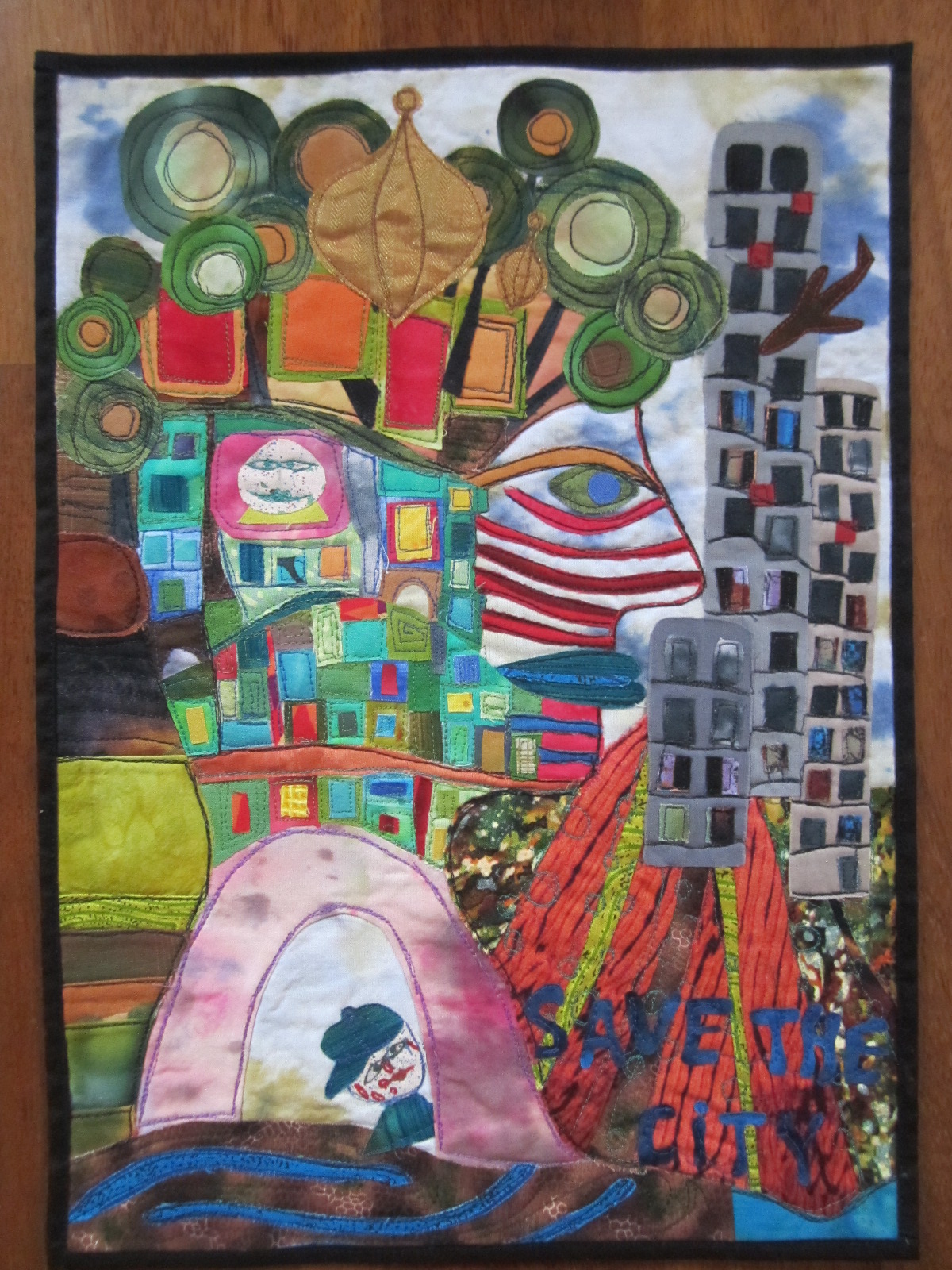 Ici on reconnaît des idées de plusieurs tableaux du peintre autrichien Hundertwasser. L’accent est mis sur ses idées profondément écologiques et son combat contre les lignes droites de notre monde moderne. Ce tableau montre un arbre-personnage aux fenêtres rappelant des tableaux de son compatriote Klimt, poussant dans une ville qu’il faut humaniser… Bravo à la créatrice !