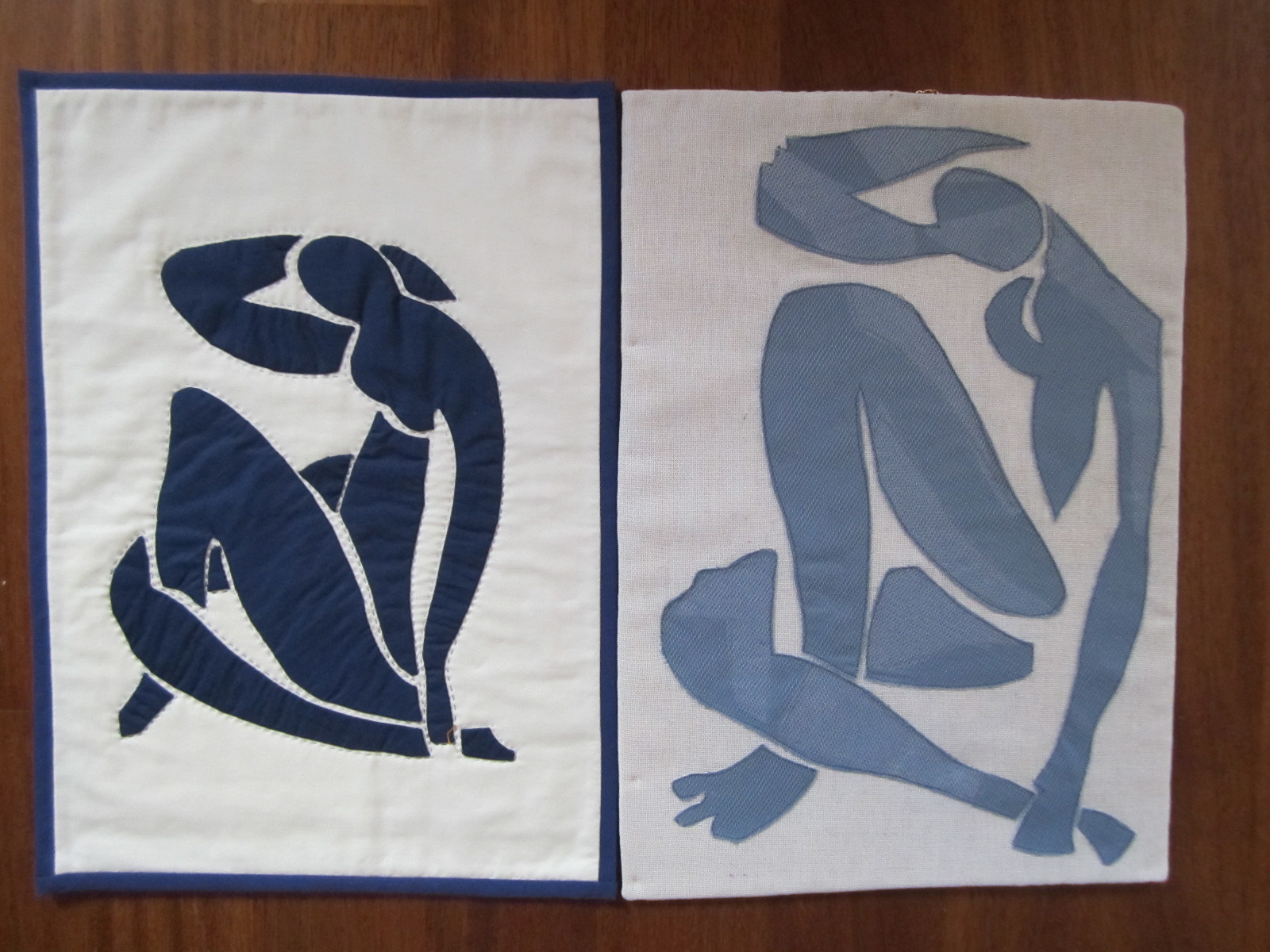Nus Bleus de Matisse : le peintre, malade, faisait des tableaux en collages de papiers gouachés à la fin de sa vie (1952). Ces deux Nus interprétés en tissus par deux Drômoises en font partie, ressemblants mais différents