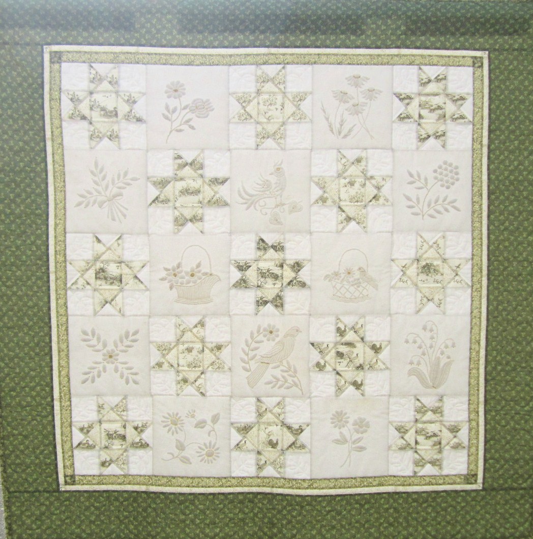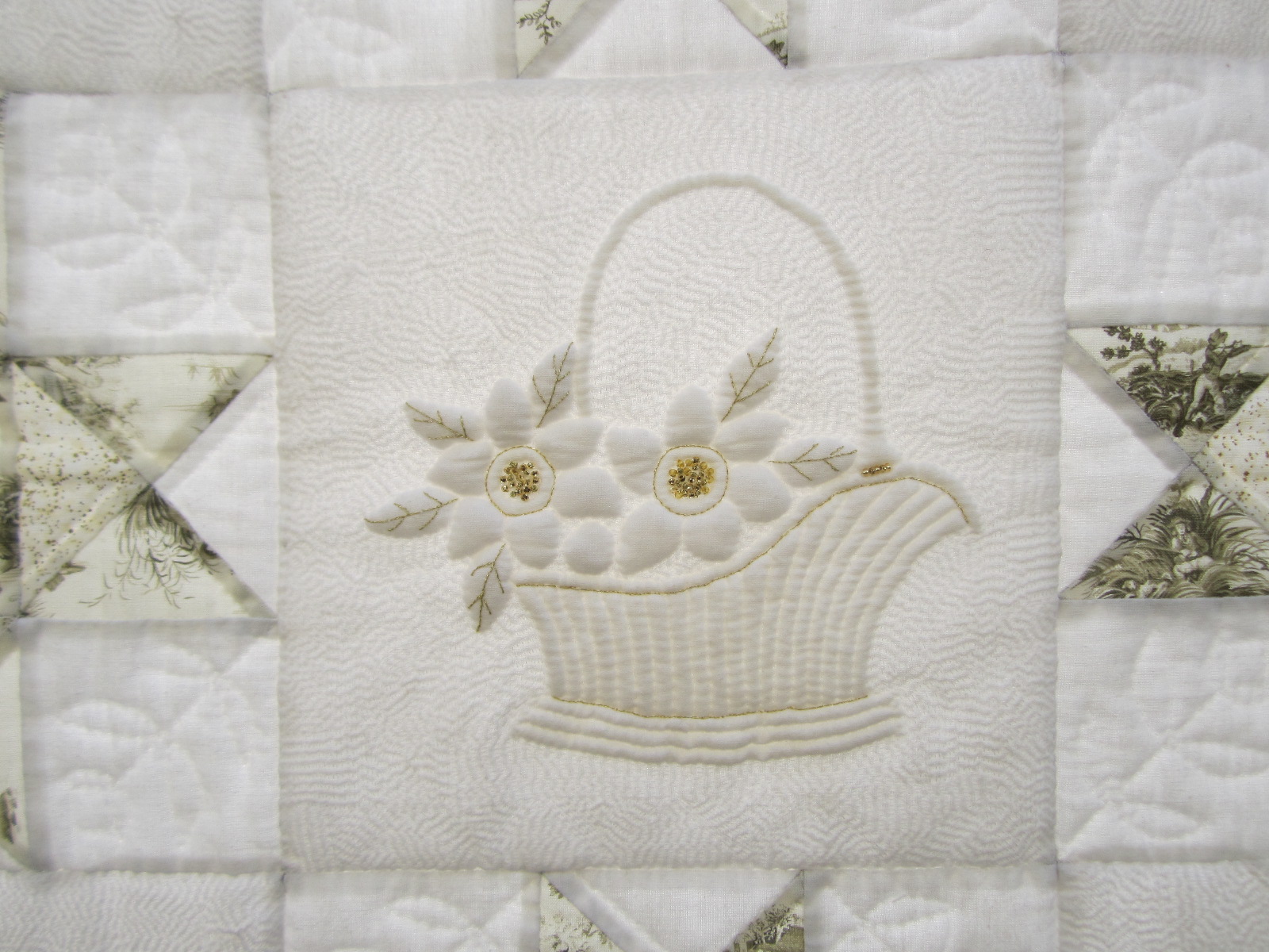 Il est absolument magnifique….Quelle patience pour l’auteur, car après avoir fini son quilt et au lieu de l’exposer comme il se doit, elle a dû commencer le trapunto et je peux vous dire que c’est du travail…mais le résultat est là !