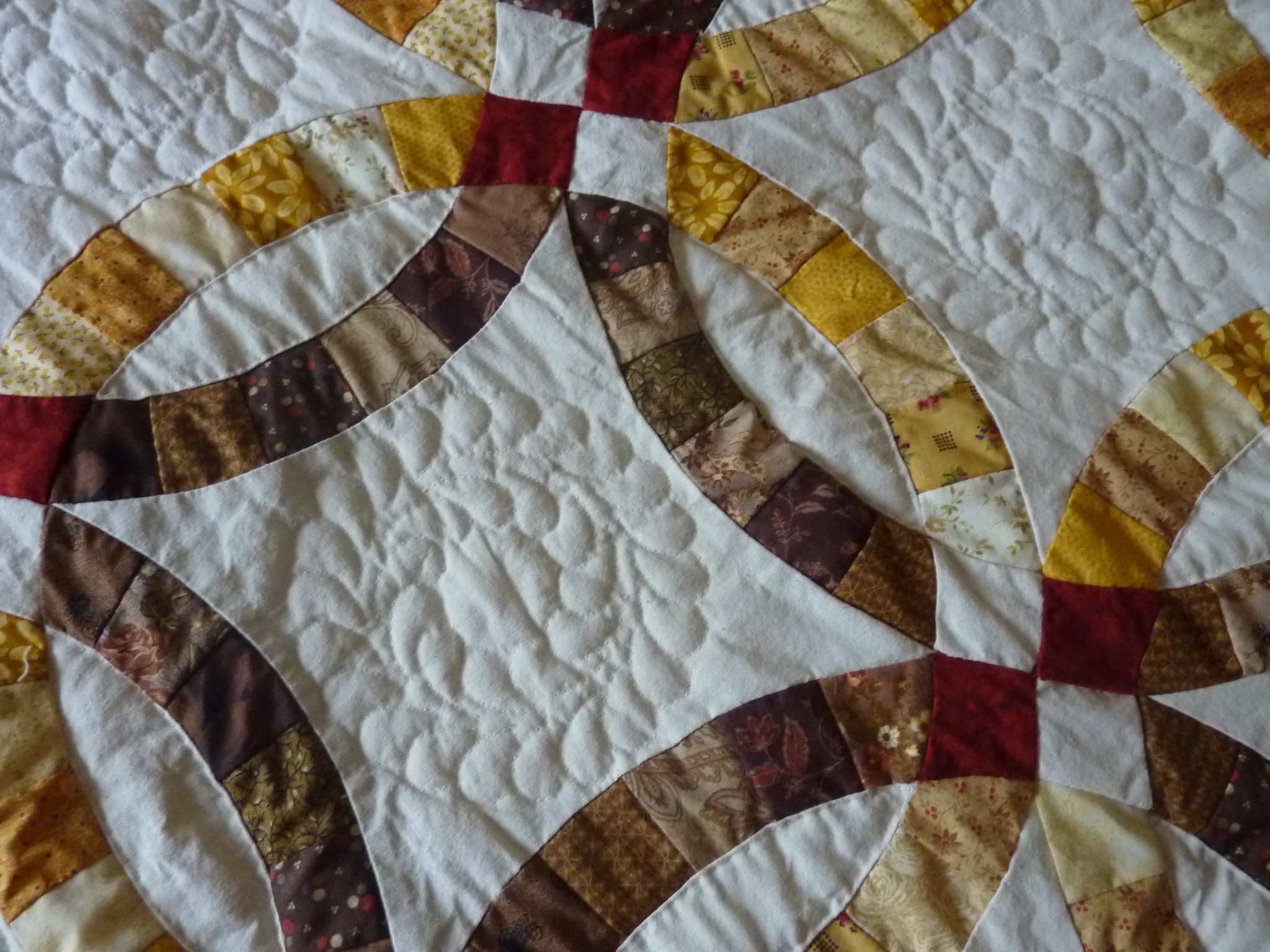 J’ai voulu des couleurs douces et chaudes qui me correspondent et tout simplement, le scrap permet aussi d’écluser des bouts de tissus que l’on ne pourrait pas utiliser pour faire de gros blocs ! Nous fêterons nos 20 ans de mariage en juin cette année, alors les anneaux de mariage s’imposaient.