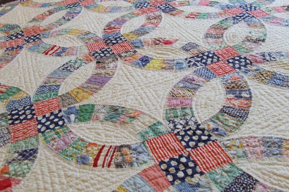 Quilt américain, probablement des années 1930. Notez les centres « patriotiques » qui rappellent de toute évidence le drapeau  étasunien. Quilt en possession de Tim Latimer.