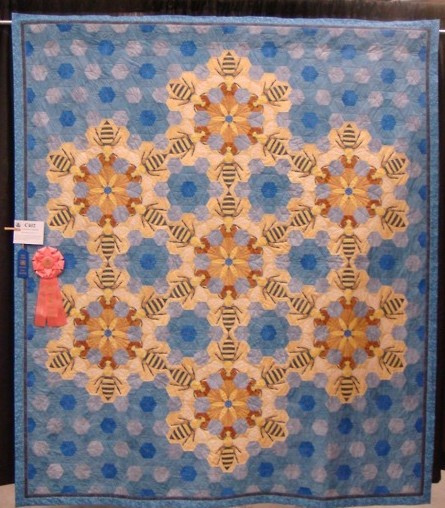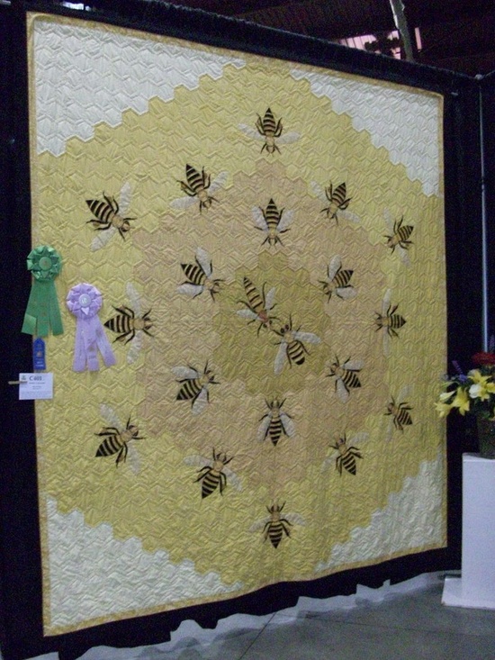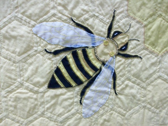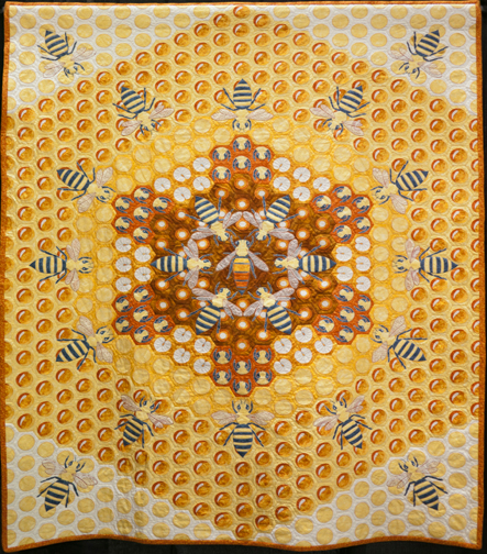 Quilt multi-primé de Hope Johnson, Honey I’m home, terminé en 2009. Cette idée couvait depuis une vingtaine d’années chez cette quilteuse. Chaque abeille est reproduite selon ses caractéristiques (les abeilles ouvrières, les faux-bourdons et la reine) et leur taille est proportionnelle.