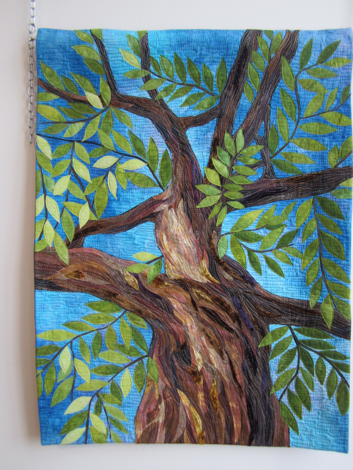 Branching out (52 x 71) – On voit bien les détails du tronc avec ses multiples nuances. On comprend aussi la technique de l’artiste : de l’appliqué « à cru », collé au thermocollant et animé par un quilting en piqué libre qu’elle qualifie volontiers « d’imparfait et artisanal », pour bien souligner sa démarche d’expression personnelle !