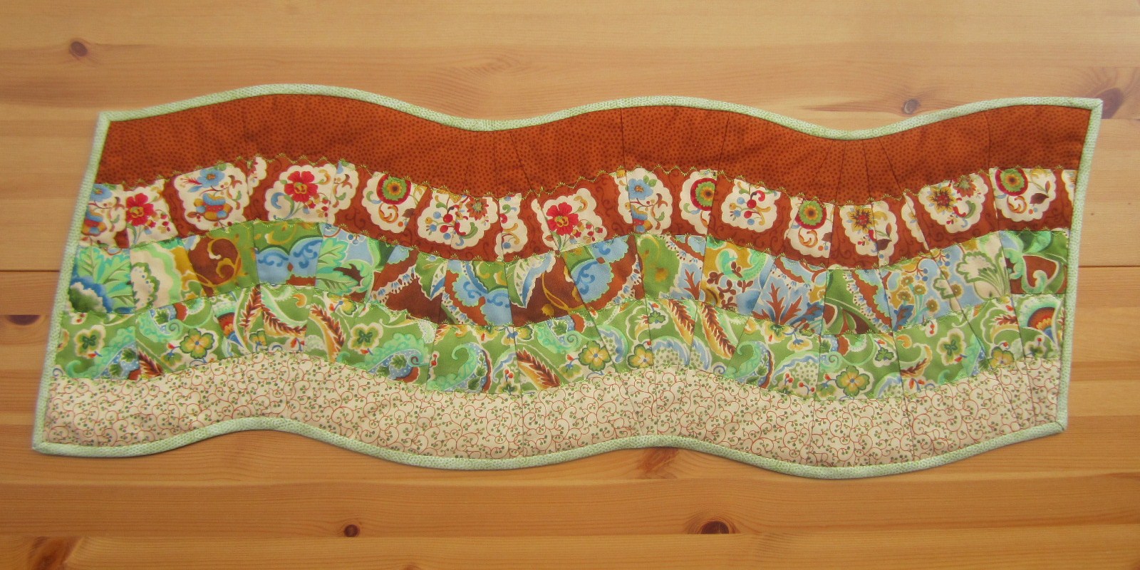 Pris à l’intérieur, les couleurs changent singulièrement… Le secret de ces ondulations réside dans la coupe. Vous choisissez 5 tissus, coupés de lisière à lisière d’une hauteur ici de 6,5 cm (c’est ici un reliquat d’un Jelly Roll, ensemble de bandes de tissus pré-découpés). On les assemble pour en faire un pavé. Puis on les coupera en trapèzes avec une règle originellement faite pour les assiettes de Dresde (voyez la règle « easy dresden » ici). Il faut alterner le sens des trapèzes, les couper tête-bêche tout le long du pavé. Ensuite, j’ai organisé les tranches 3 par 3 pour créer les ondulations.