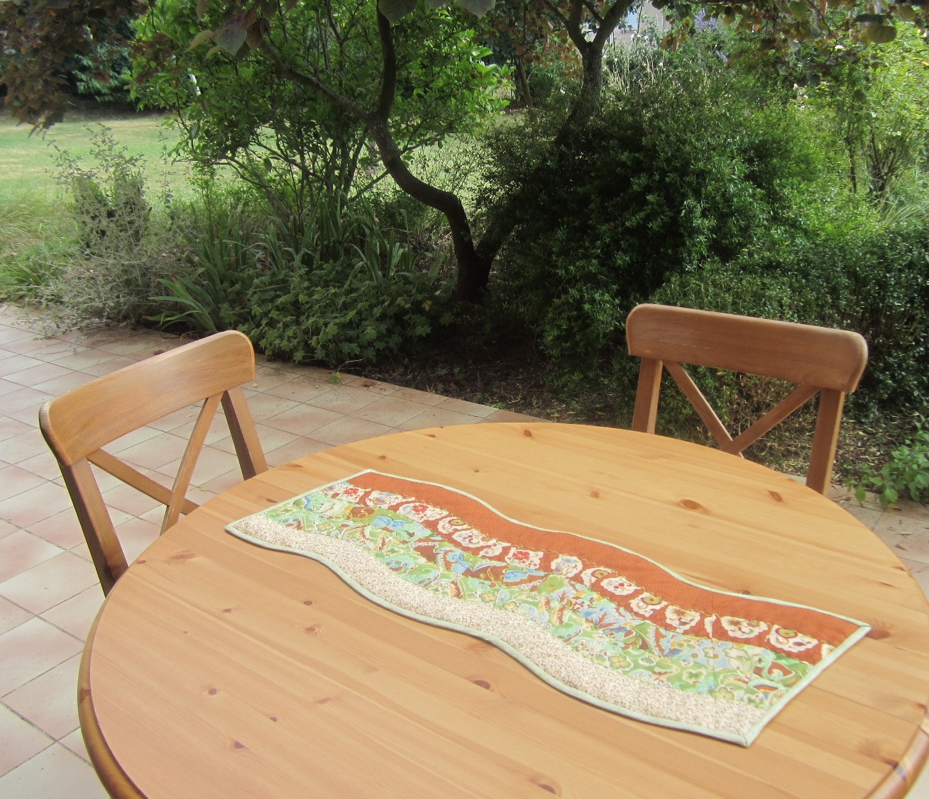J’ai beaucoup butiné de blog en blog cet été et mine de rien, j’ai stocké beaucoup d’idées. J’ai mis longtemps à retrouver l’origine de mon inspiration. Finalement, cela vient de Finlande, chez Ulla : http://quiltworld2.blogspot.fi/2013/07/table-runner-quilt-kiemuraliina.html .