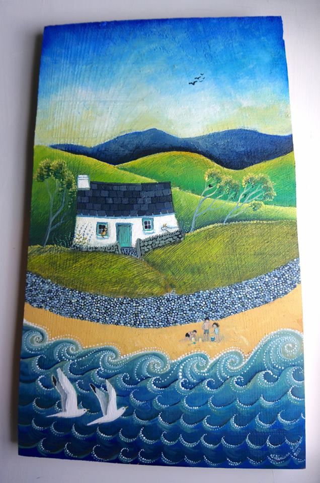 Oh oui, le bleu est presque toujours présent dans ses tableaux, et elle m’a appris qu’il existe le même mot en breton (de France) et en gallois : glaz ou glas, qui est une notion de couleur un peu floue qui va du bleu au gris en passant par le vert, couleurs que prend la nature et en particulier la mer avec le ciel changeant qui s’y reflète… Comment ne pas devenir poète avec ça ?…