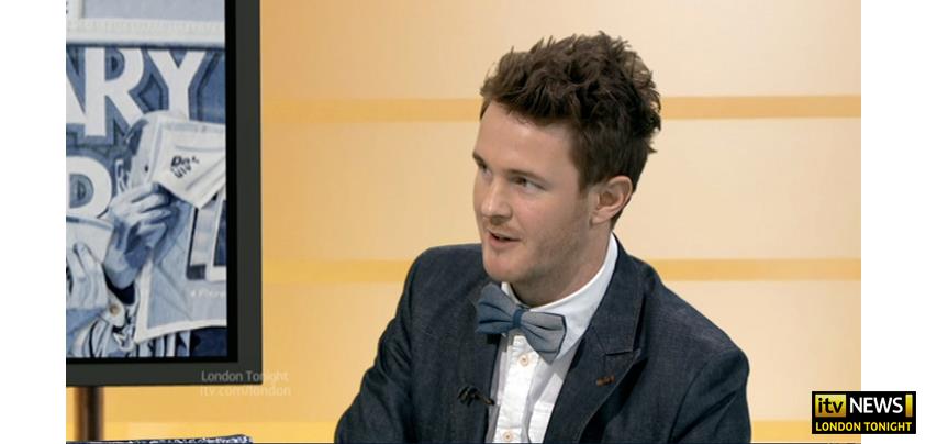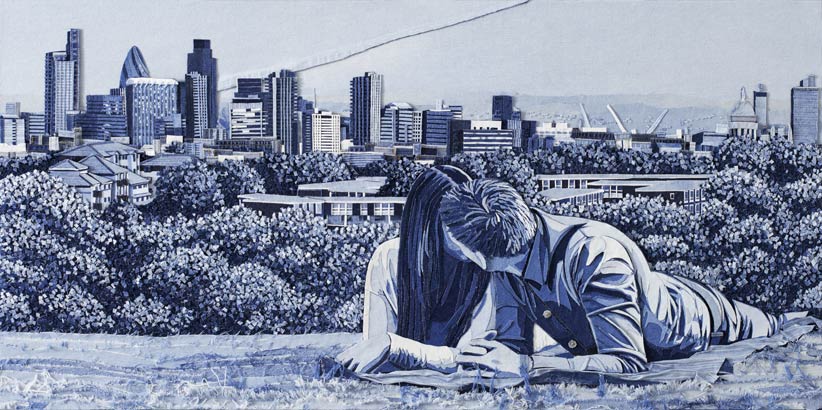 Comme toujours, j’entre en contact avec les artistes que je présente car je me permets de parler d’eux, alors autant qu’ils en soient informés directement par moi-même et qu’ils puissent avoir un droit de réponse ! ITV NEWS - janvier 2013Denimu, présenté hier, est un jeune homme très sympathique et disponible. La photo ci-contre le montre lors d’un passage à la TV britannique ITV… avec un nœud papillon en denim of course ! Ian m’a cependant très gentiment fait remarquer que mes choix d’illustrations étaient un peu… datés, ses panoramas sur Disney étant parmi ses premiers tableaux. Je comprends ce qu’il veut dire, la dernière oeuvre est toujours la plus aboutie chez un artiste comme lui qui peaufine chaque détail ! Même si les vues de villes faites sur Disney sont remarquables, ce n’est « rien » en comparaison de ses tableaux récents, si parfaits que nous oublions qu’il s’agit de denim exclusivement. Même les taches de couleurs sont de pantalons ou de vestes du même sergé de coton, simplement coloré autrement.