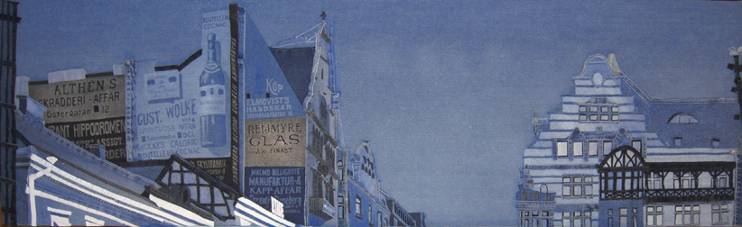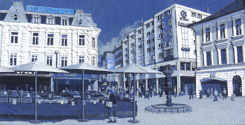 Place à Malmö, ville au sud de la Suède. Le titre « Färska Blåbär » évoque les myrtilles fraîches, fruits qui poussent bien dans ce pays, à la couleur bleu indigo… La perspective, les pierres des bâtiments sont incroyablement bien rendus.