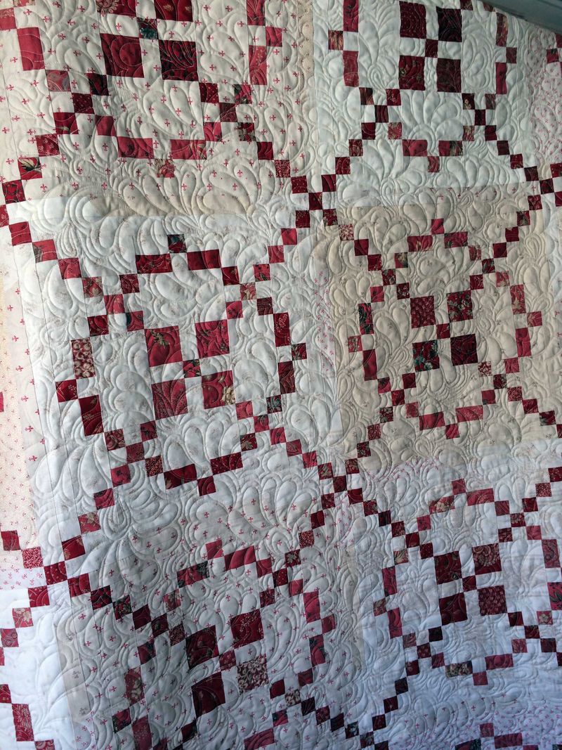 Ce bloc n’est pas très connu, j’en ai fait la connaissance grâce à Annick Huet (vu dans son livre « Patchworks traditionnels bicolores ». Elle y raconte, oh surprise, que ce bloc représente un plan de bataille lors de la guerre d’indépendance en 1777 ! Ses carrés font 3 cm cousus, proches donc des 2,5 cm des Américaines pour ce modèle.