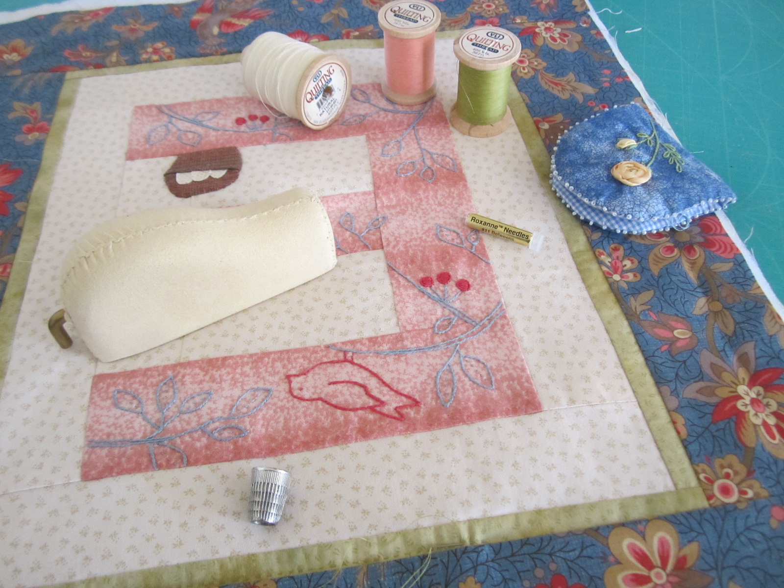 Tout d’abord, le tableau est ici en début de quilting. Oui tout est à l’envers : le E, ma ligne de quilting en cours de gauche à droite… Je suis gauchère ! Vous voyez mes petits outils : des fils YLI, des aiguilles « between n° 11 » de chez Roxanne (en tube), le porte-aiguille offert par Kristine, et le gros machin est un poids (1,5 kg) qui aide à quilter sans cercle, créé par Yoko Saito. Je le trouve très pratique pour les mini-quilts, trop petits pour entrer dans mon cercle, et les bordures.