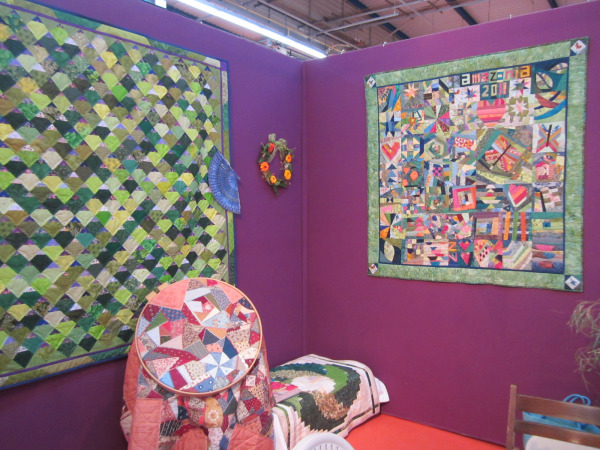 Stand France-Patchwork tenu en octobre dernier au salon des tendances créatives de Toulouse : ce quilt était déjà fini et la couleur de nos murs nous a fortement incitées à exposer ce lot en avant-première (à gauche) ! Il a été très remarqué par les visiteurs. En cours de quilting, la Folle Etoile qui sera un lot de Carrément Carré.