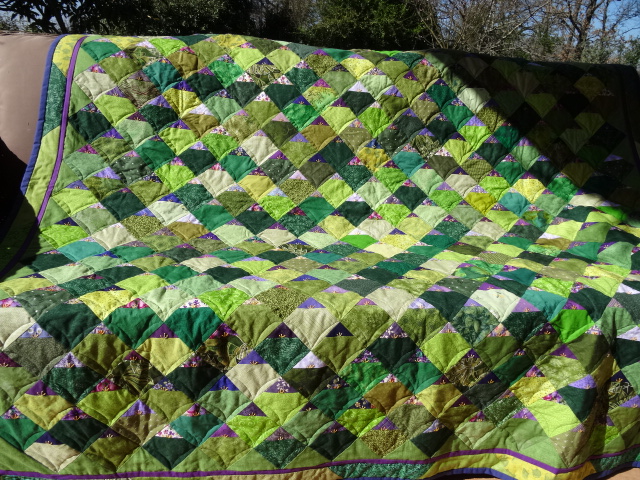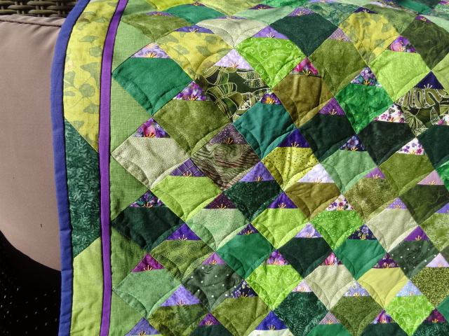 Ce quilt très scrappy plaît… même à celles qui n’aiment ni le vert ni le violet 😉