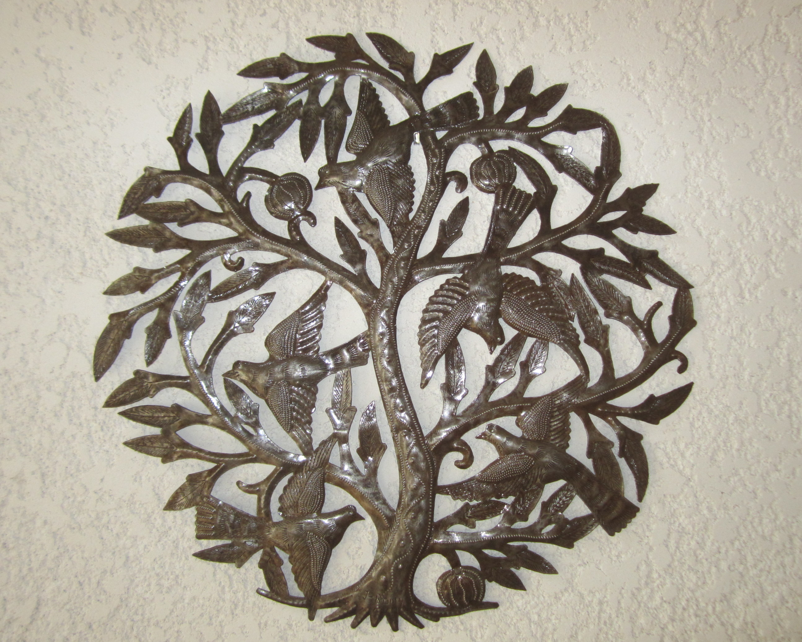 A l’extrême droite de la photo ci-dessus, vous pouvez deviner une sculpture en fer découpé, spécialité du village haïtien Croix-des-Bouquets. Ces artisans travaillent magnifiquement cette matière dans un style unique, toujours lié aux pratiques vaudou. J’ai chez moi, au-dessus de la cheminée, un Arbre de Vie haïtien :