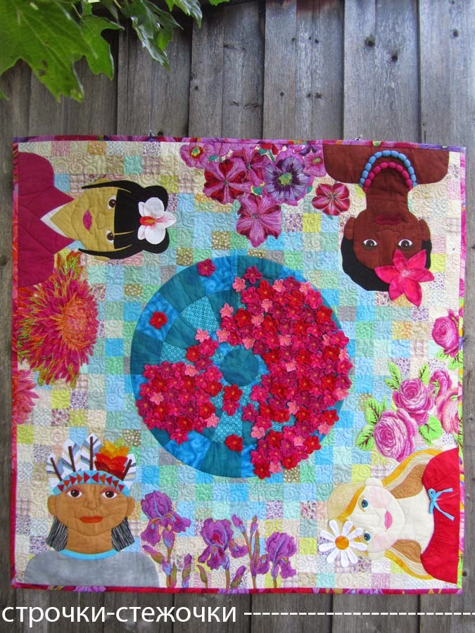 Ce tableau présente des enfants de 4 continents auprès desquels poussent des fleurs de leur environnement. Au centre, notre planète que Natalia espère qu’elle restera toujours fleurie… Les appliqués main sont enrichis de nombreux détails en 3D et le quilting machine est partie intégrante du dessin. Les fleurs disposées sur la planète forment les continents… vus du Pôle Nord, pas si loin de Novossibirsk ! Une fois encore, je vous engage à aller voir tous les détails ici. Avec ce quilt, c’est un message d’espoir pour que les enfants de différentes nations vivent dans un monde fleuri rempli de belles personnes…