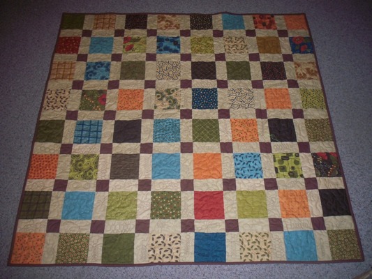Jo de l’Iowa a fait plusieurs « disappearing nine-patch », en voici un disposé comme Ensemble, c’est tout, mais sans tenir compte des couleurs. Cela donne un très beau scrap-quilt :