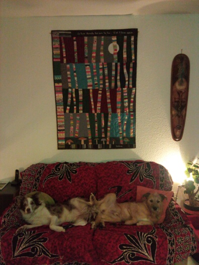 8. Your beautiful « White Moon » quilt is perfect on the wall at your daughter’s new home. It fits so well with the treasures from her travels and the dogs! That photo of the two of the two dogs is priceless!
