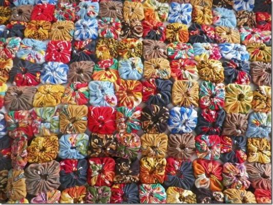Non, ce n’est pas plié exprès, c’est le pli naturel en assemblant les yoyos de manière rustique. Si tu ne veux pas ce petit pli, tu dois faire attention d’avoir une aiguille fine et du fil fin (ce qui n’est pas le cas ici) et prendre juste 2 ou 3 fils du tissu, pas plus ! C’est aussi pour cela que les yoyos ont une forme presque carrée, car elle cousait de manière à laisser le moins de jour possible.