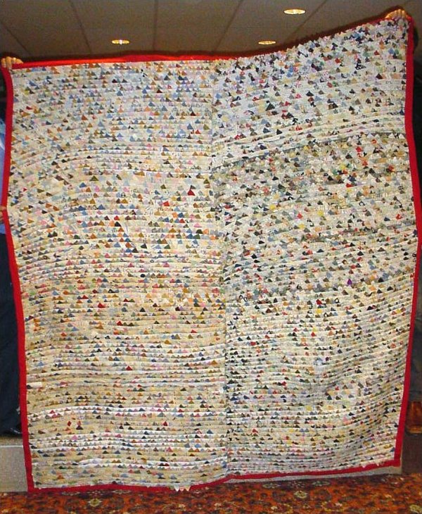Ce quilt est entièrement réalisé à la machine. On devine que les carrés sont pliés différemment et disposés non pas en cercles comme pour la plupart des Pine Cone traditionnels, mais en ligne, ce qui ouvre bien d’autres perspectives esthétiques. D’ailleurs, il nous reste quelques quilts témoins de cette option qui n’avait pas échappé à des quilteuses d’antan :