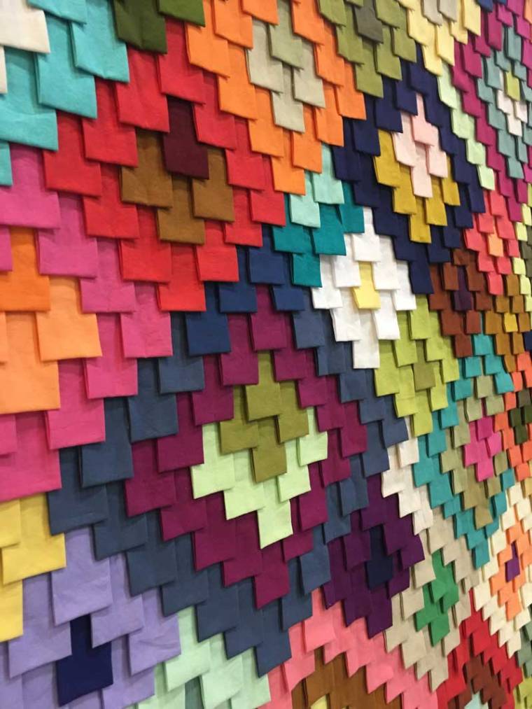 Une autre artiste travaille sur ce thème du « petit carré plié » depuis quelques années, c’est Tara Faughnan. Elle utilise uniquement des tissus unis mais ne manque pas d’inspiration ! Allez voir sa galerie de quilts, vous y trouverez forcément de l’inspiration.