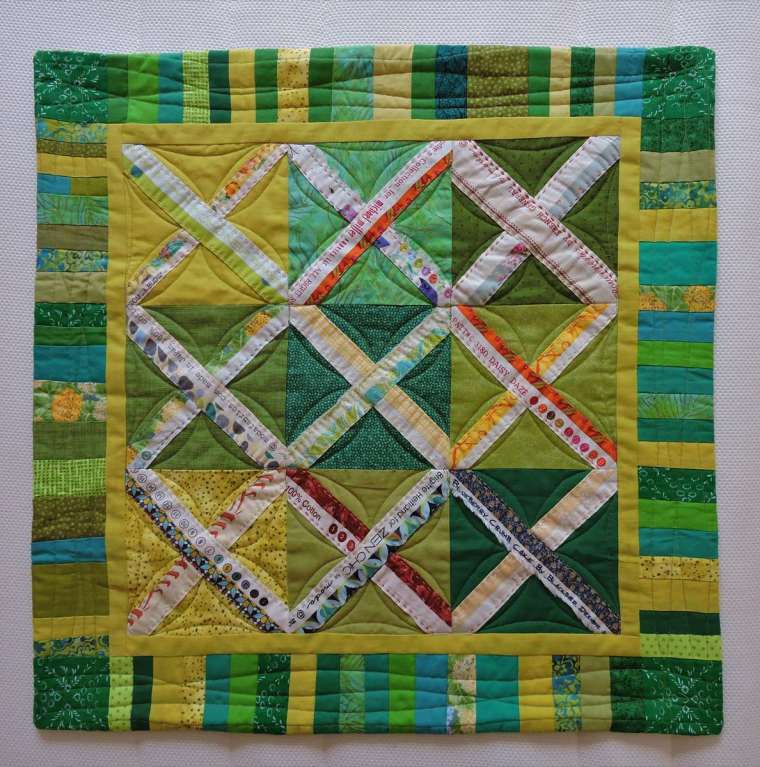 Voici un petit quilt appelé Creutzwald, avec un bloc simple créé pour l’occasion, invitant à utiliser les lisières. J’ai insisté sur mon goût de la simplicité, des quilts sans autre prétention que faire plaisir, en voici une illustration ! La journée était aussi sous le signe de la couleur du printemps et de la forêt proche, le vert. J’ai été désolée d’apprendre qu’une adhérente n’est pas venue, n’aimant pas du tout cette couleur… Pour en savoir plus sur cette couleur ambivalente, adorée ou détestée, rien de mieux que le livre Vert de Michel Pastoureau !