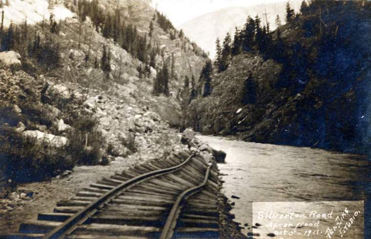 Durango et Silverton sont deux villes distantes de 70 km, une route superbe en cette mi-septembre. Ces villes sont nées à peu près en même temps, liées par un célébrissime chemin de fer touristique. Naguère ce train servait notamment de transport du minerai extrait des mines de Silverton vers Durango, où il était traité. Hier comme aujourd’hui il faut toujours lutter contre les éléments, ici une photo montrant les dégâts d’une pluie diluvienne en 1911 sur le chemin de fer qui longe la rivière Animas.