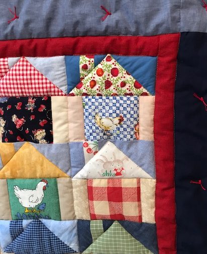 De plus, je voulais utiliser mes tissus à motifs enfantins et mes chutes UNIQUEMENT pour le ciel et les murs… et même les bordures, ce qui m’a suggéré ce semblant de log-cabin avec quatre bleus différents.