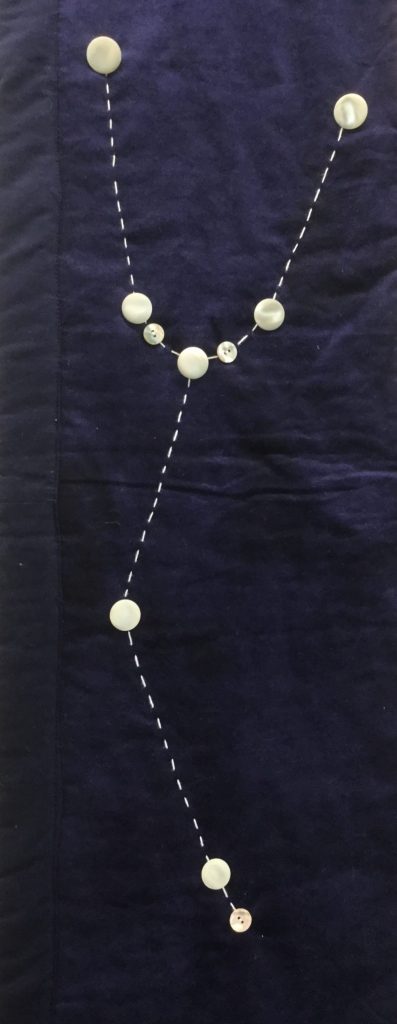 Nathalie a réalisé le quilting. Magali, Maryane et Nathalie ont brodé les constellations ponctuées de boutons en nacre, jusqu’en mars 2019 !