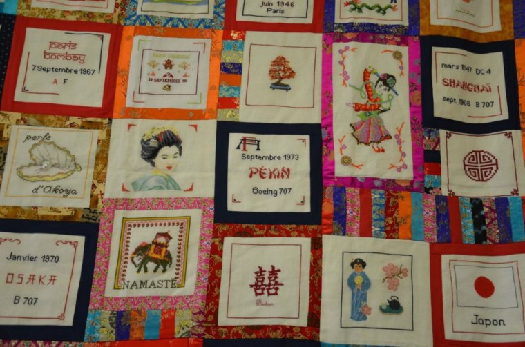 Le personnel navigant d’Air France a une vie de rêve d’un côté — ah le bonheur des voyages ! — mais aussi de très nombreuses contraintes, je vous assure. Je le vis de l’intérieur avec une de mes sœurs, la petite jeunette de 13 ans ma cadette, qui exerce ce métier depuis une vingtaine d’années. Pour se recentrer, oublier le stress, que font certaines d’entre elles ? Elles brodent, elles quiltent ! Une hôtesse de l’air de notre compagnie nationale a organisé plusieurs événements artistiques et leurs ouvrages voyagent au gré des invitations.