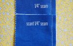 Sauf que… il y a l’épaisseur du tissu, celle du fil, le pli… et pour avoir un résultat absolument parfait, il faut coudre juste un peu moins que le quart d’inch, en anglais on dit coudre a scant quarter inch seam allowance.